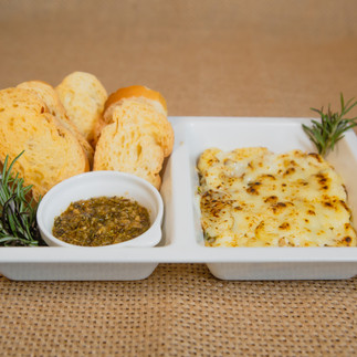 Descrição: Pirão de aipim coberto por duas camadas de queijo coalho, sendo uma maçaricado e carne seca acebolada. Acompanhada por salada de tomates verdes e banana caramelizada.